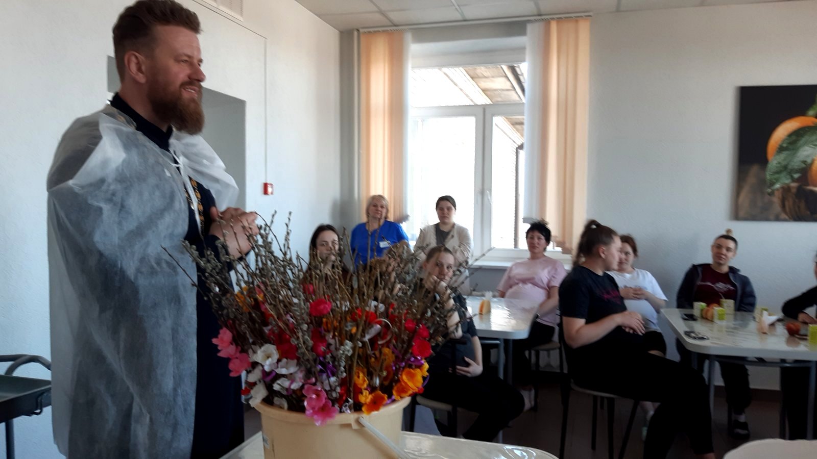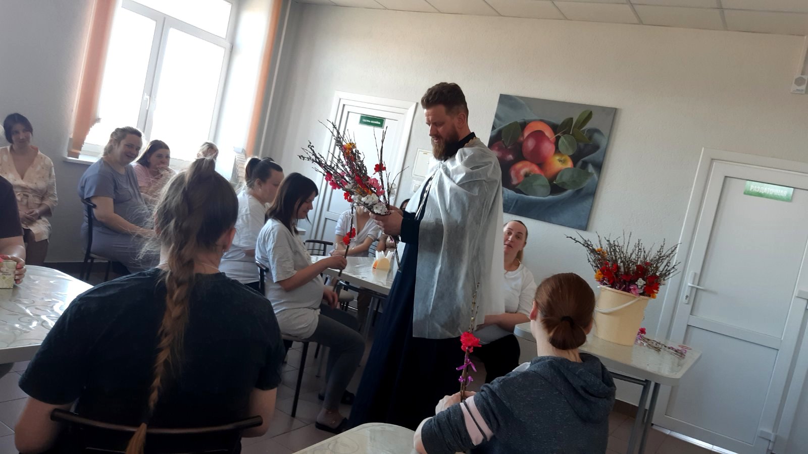 При организационной поддержке психолога роддома Русановой Екатерины Дмитриевны священник провёл три круглых стола с беременными и пациентками гинекологических отделений. «Верба, как и кулич, и вода не является «героем» праздника. Во всех случаях, речь о Христе. Вербное воскресенье – это историческое событие входа Христа в город Иерусалим. Начало Его страстного пути к Кресту. Войдя как царь, он станет угнетённым и избитым. Но пока, мы вспоминаем детей кричащих «Достоин!!!» Господу, кидающих под ноги пальмовые ветви. В нашей традиции мы одариваем себя и родных вербочками – напоминая себе и всем о полноте жизни, о начале возрождения и зарождения. Для Вас – беременных важно напомнить о жизни и её начале, Вам надо понимать своё предназначение и ту роль в создании новой жизни. Конечно в эти дни мы хотим вам подарить хорошее настроение и улыбки, которые являются важными в успешном родоразрешении». В конце встреч священник одарил всех красиво украшенной прихожанами храма иконы Божией Матери «Всех скорбящих радость» д.Гора вербой. Духовник роддома прошёл с подарками и словами радости ко всем медработникам и администрации учреждения.