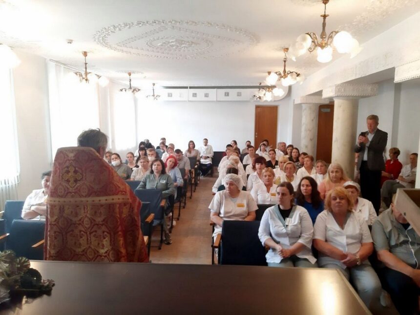 Заведующий методическо-организационным отделом Андрей Васильевич Захаров рассказал участникам встречи врачам и медперсоналу о программе сотрудничества Витебского облисполкома и Витебской и Полоцкой епархиями», о «Неделе семьи» от святого Александра Невского до святого Петра и Февронии Муромских».
